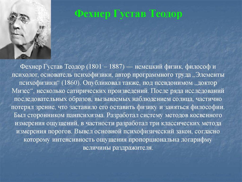 Фехнер Густав ТеодорФехнер Густав Теодор (1801 – 1887) — немецкий физик, философ и