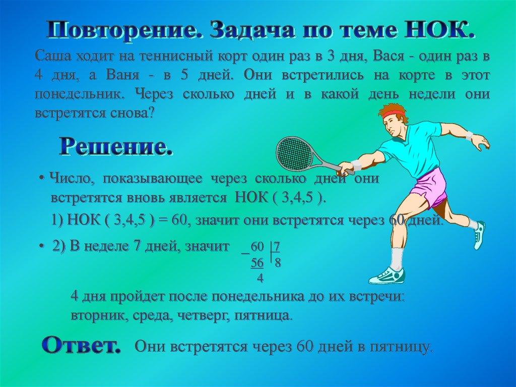 Саша ходит на теннисный корт один раз в 3 дня, Вася - один раз в4 дня, а Ваня - в 5 дней. Они встретились на корте в этот