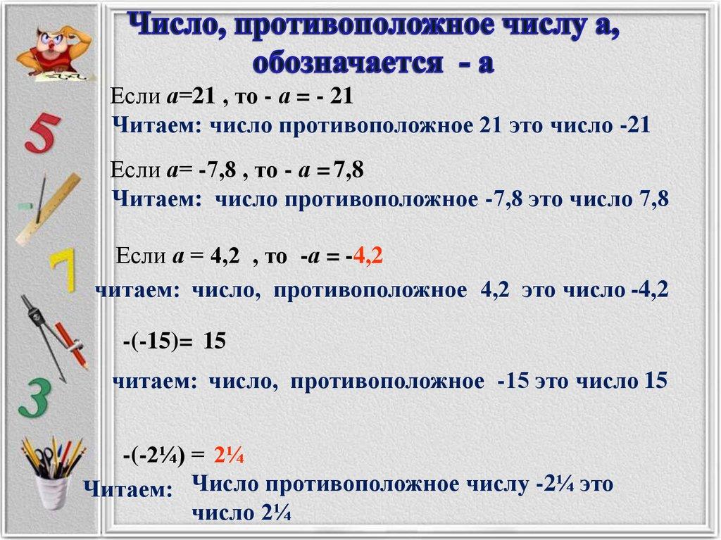 Если а=21 , то - а = - 21Читаем: число противоположное 21 это число -21