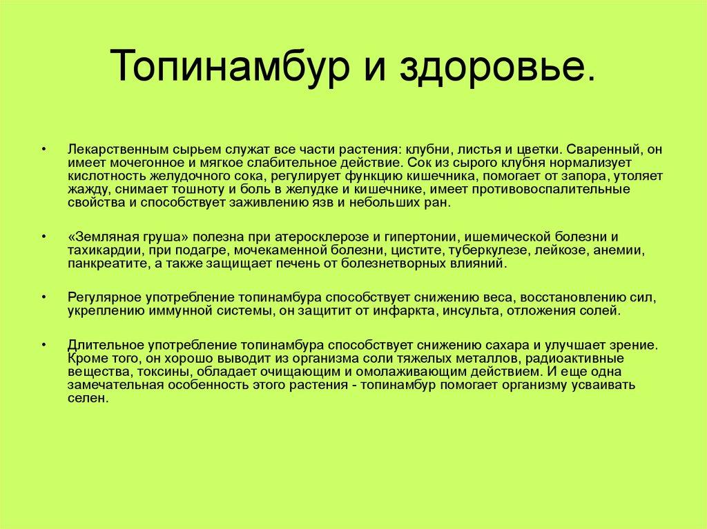 Топинамбур и здоровье.Лекарственным сырьем служат все части растения: клубни, листья и цветки. Сваренный, он