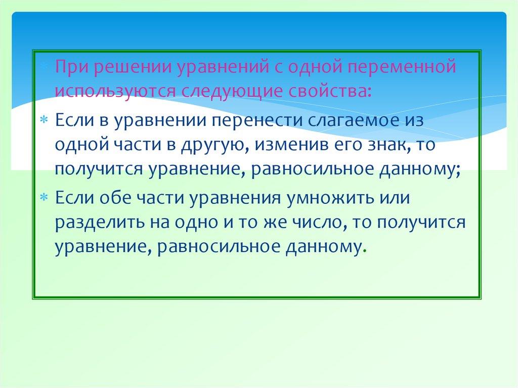 При решении уравнений с одной переменнойиспользуются следующие свойства: