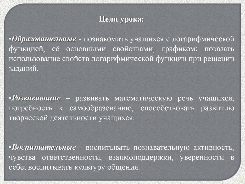 Цели урока:•Образовательные - познакомить учащихся с логарифмической
