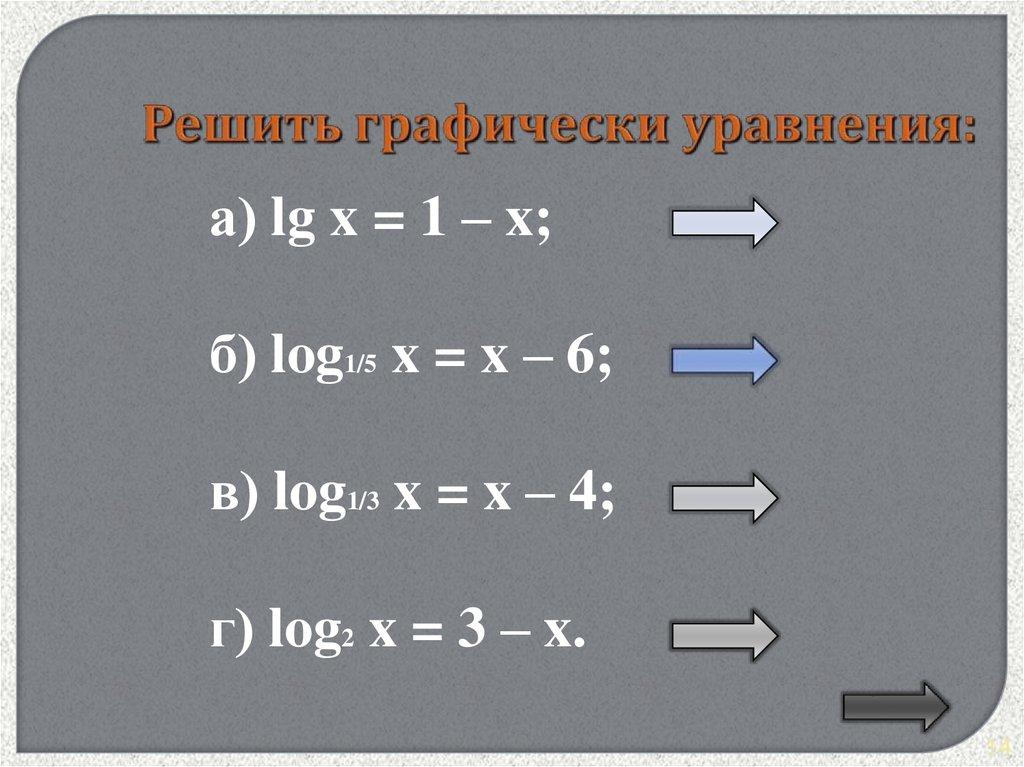 а) lg x = 1 – x;б) log1/5 x = x – 6;