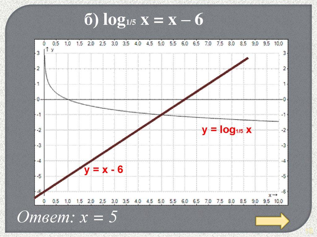 б) log1/5 x = x – 6y = log1/5 x