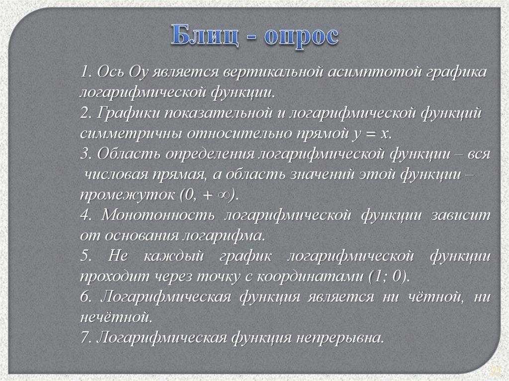 1. Ось Оу является вертикальной асимптотой графикалогарифмической функции.