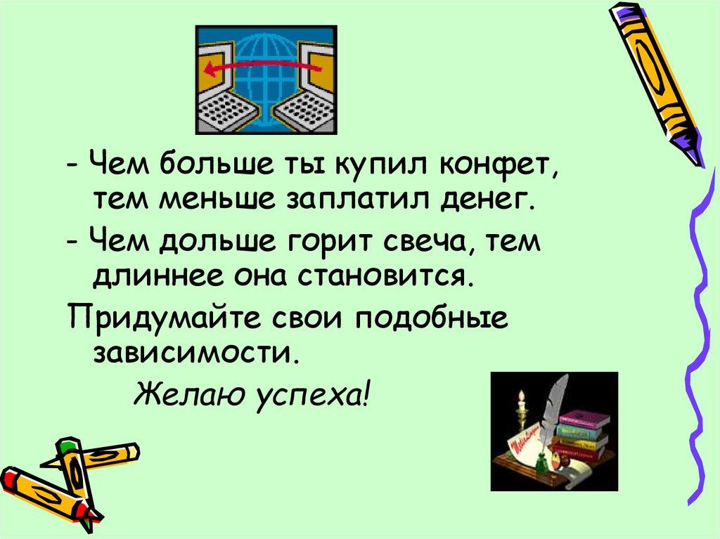 - Чем больше ты купил конфет,тем меньше заплатил денег.