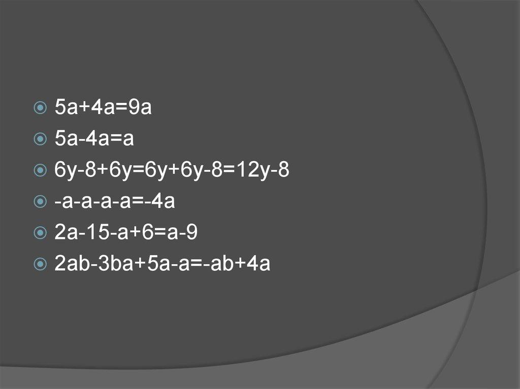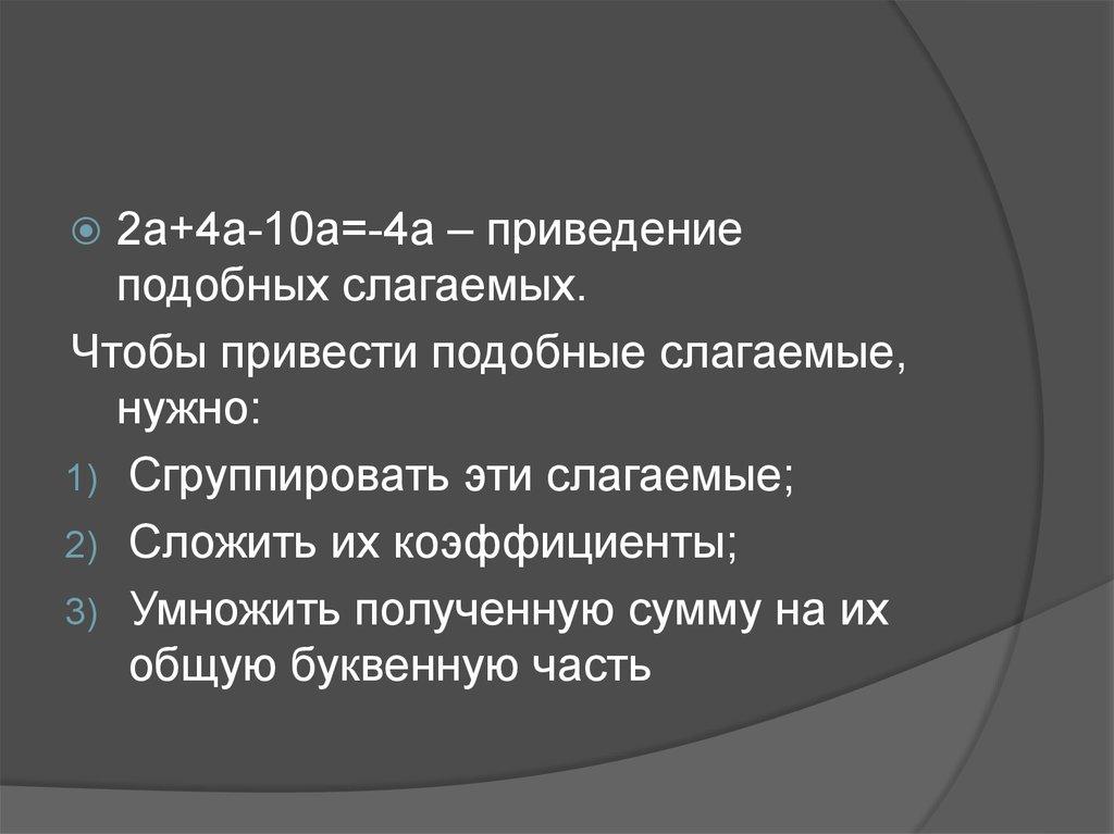 2a+4a-10a=-4a – приведениеподобных слагаемых.