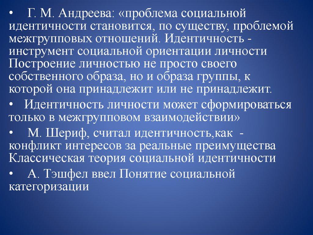 • Г. М. Андреева: «проблема социальнойидентичности становится, по существу, проблемой