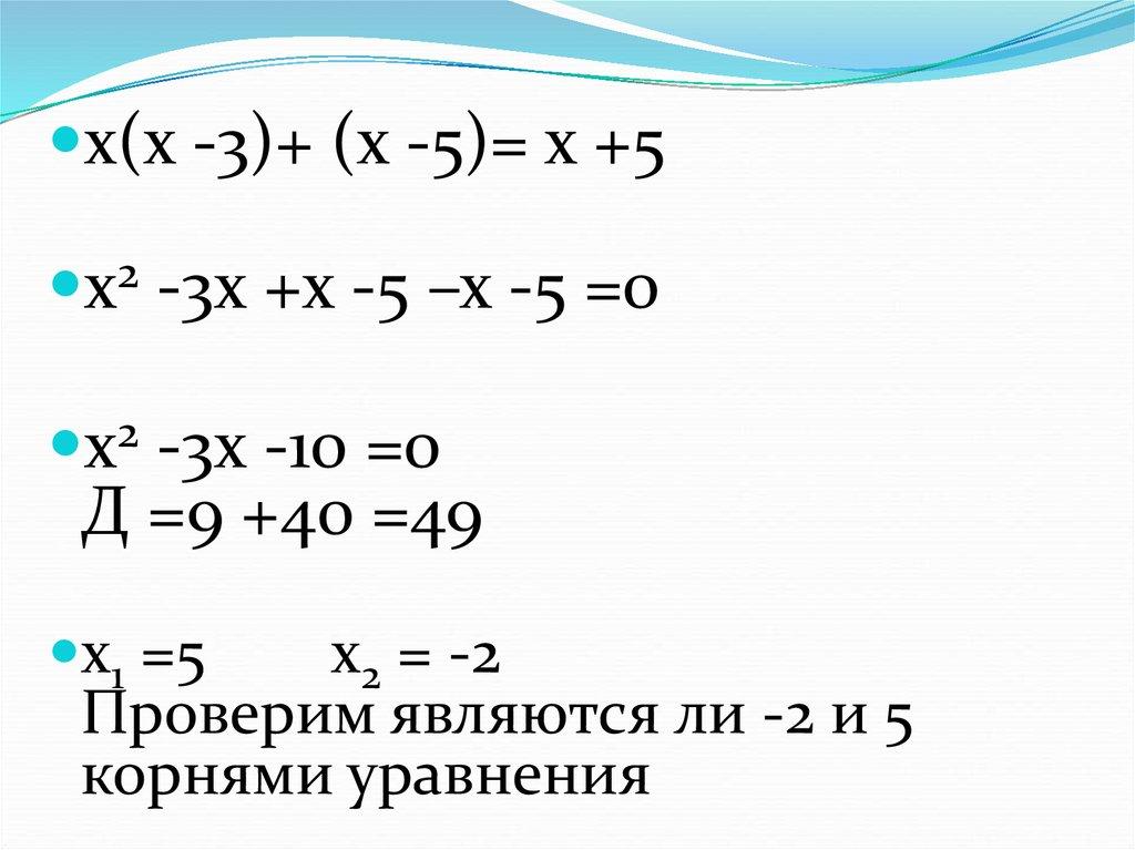 11. При х = -2 х(х -5)= -2(-2 -5) 0; При х =5 х(х -5)= 5(5 – 5) = 0. Т.к. решение х = 5 обращает общий знаменатель в нуль, корнем