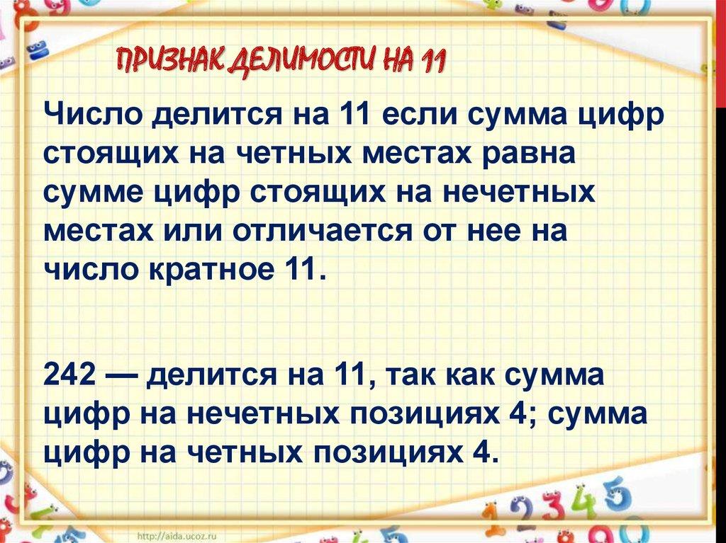 ПРИЗНАК ДЕЛИМОСТИ НА 11Число делится на 11 если сумма цифр