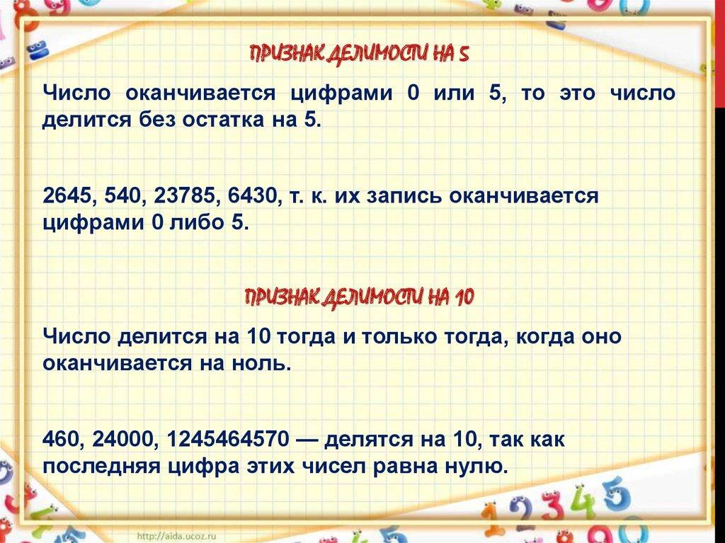 ПРИЗНАК ДЕЛИМОСТИ НА 5Число оканчивается цифрами 0 или 5, то это число