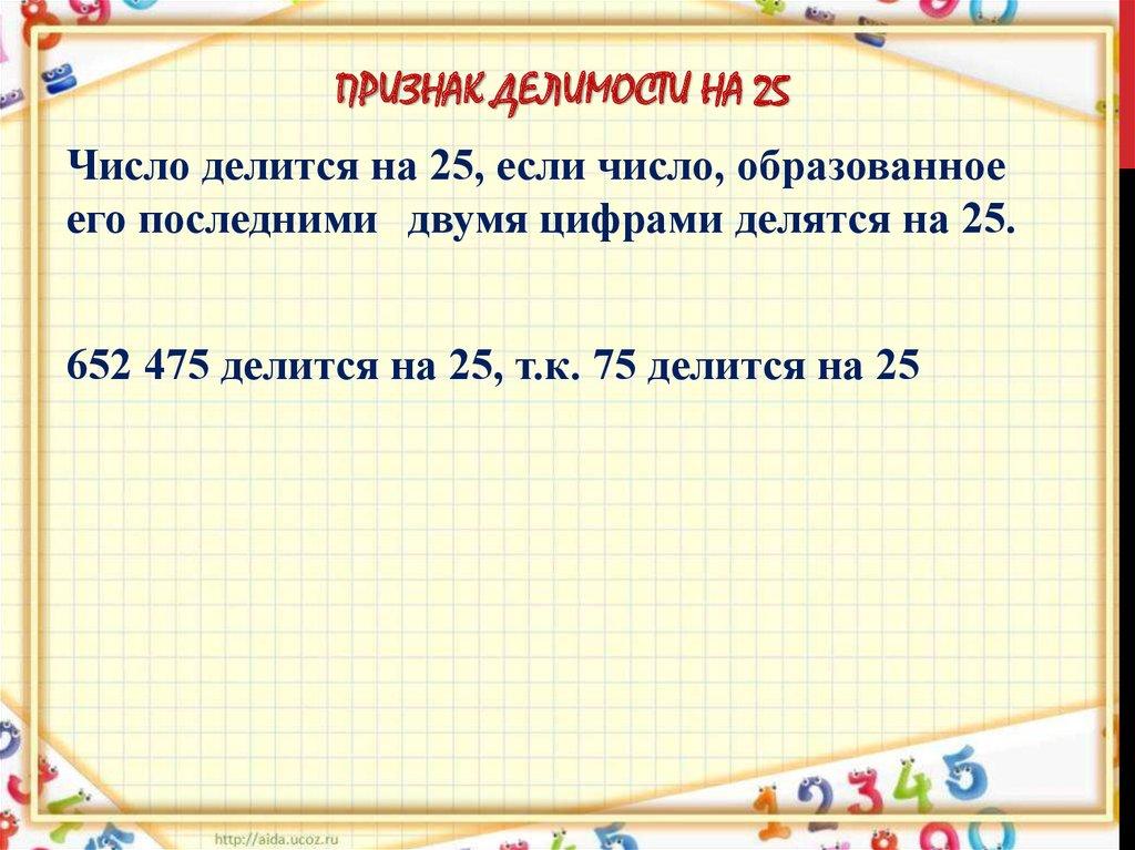 ПРИЗНАК ДЕЛИМОСТИ НА 25Число делится на 25, если число, образованное