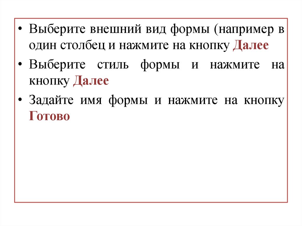 • Выберите внешний вид формы (например водин столбец и нажмите на кнопку Далее