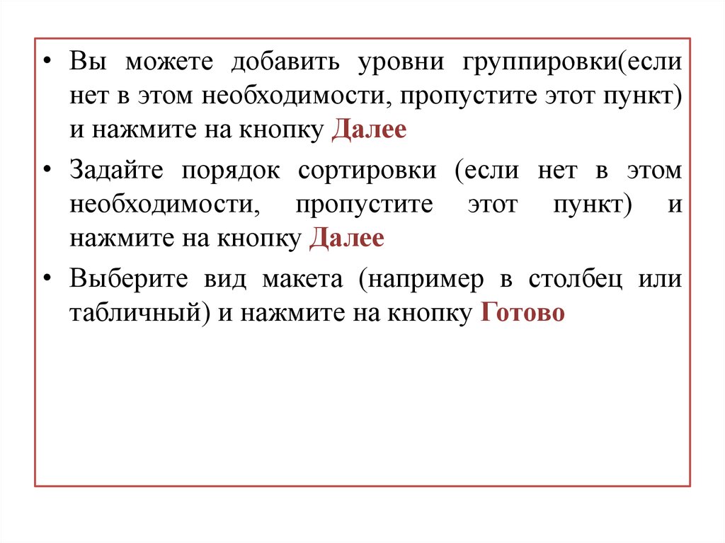 • Вы можете добавить уровни группировки(еслинет в этом необходимости, пропустите этот пункт)