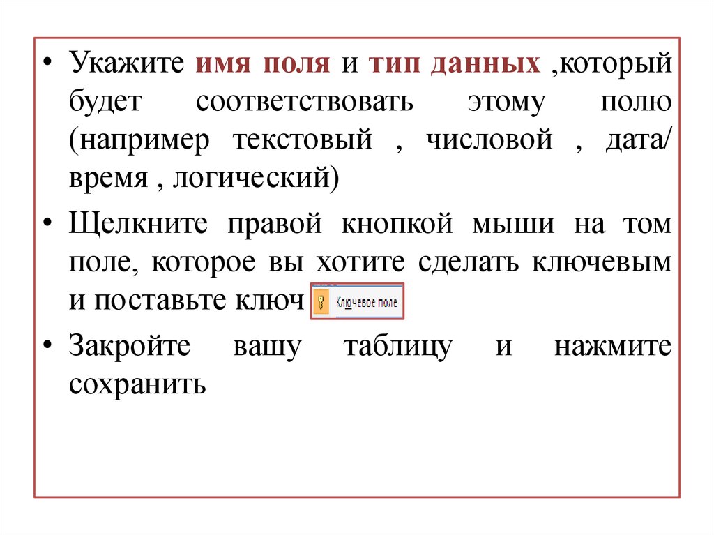 • Укажите имя поля и тип данных ,которыйбудет