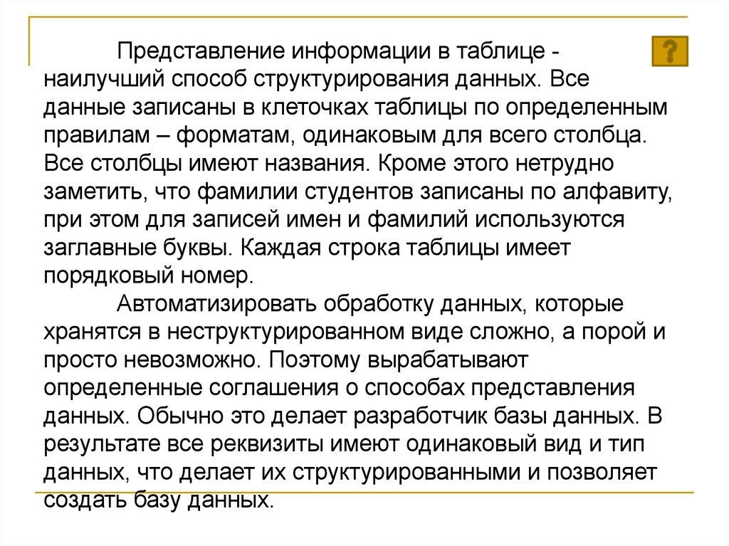 Структурированный вид хранения информации предполагаетвведение соглашений о способах представления данных. Это означает,