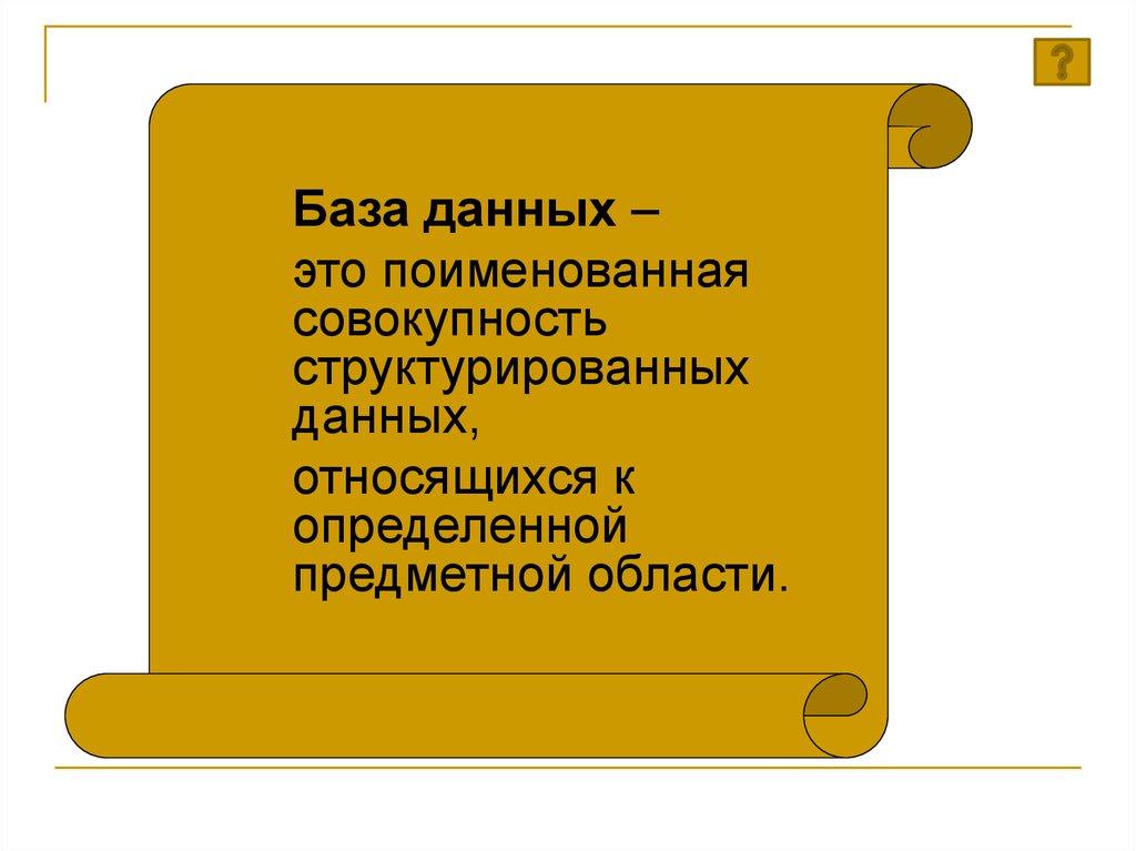 В широком смысле слова база данных - это совокупностьсведений о конкретных объектах реального мира в какойлибо предметной области.