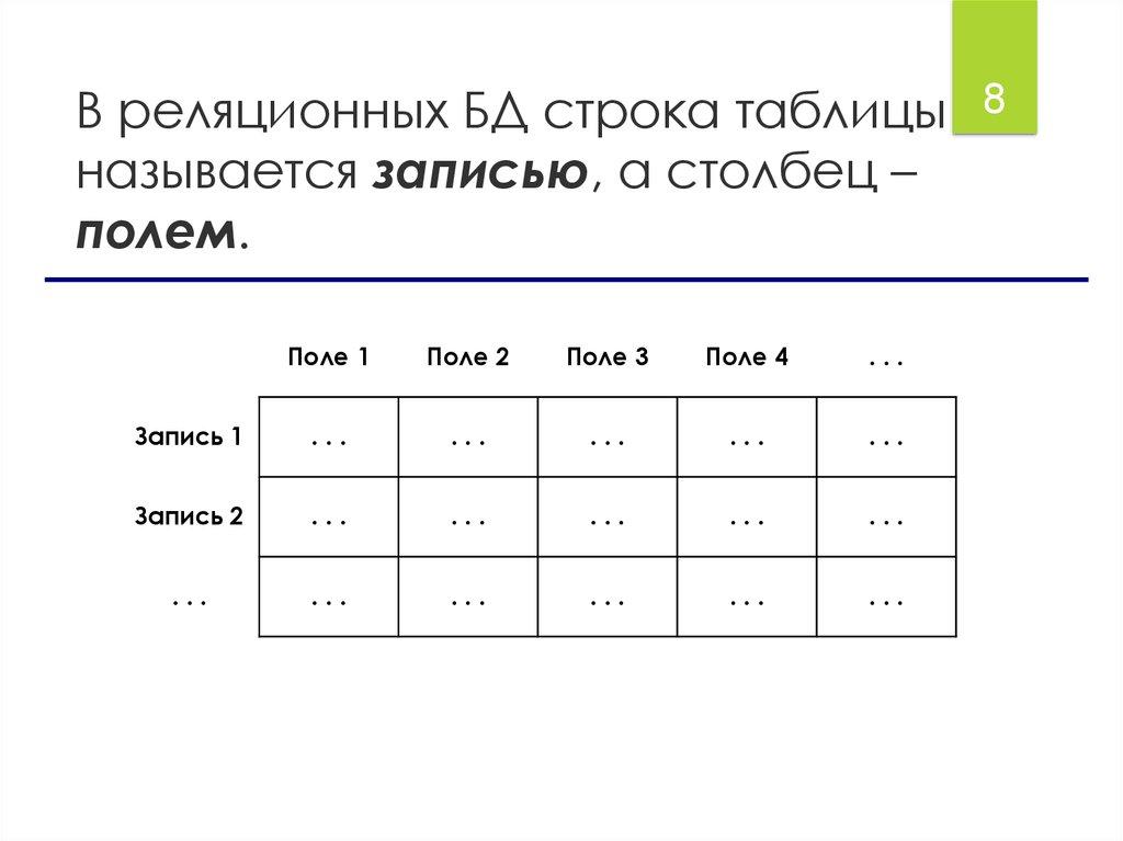 В реляционных БД строка таблицы 8называется записью, а столбец –