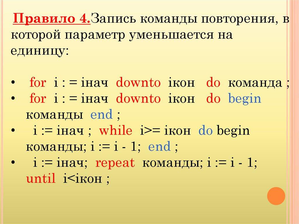 Правило 4.Запись команды повторения, вкоторой параметр уменьшается на