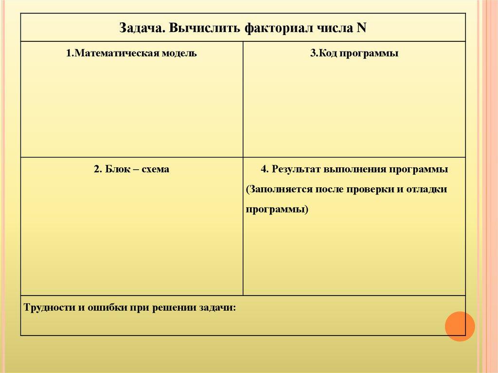 Задача. Вычислить факториал числа N1.Математическая модель