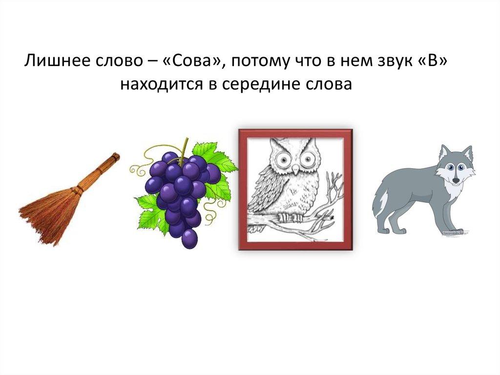 Лишнее слово – «Сова», потому что в нем звук «В»находится в середине слова