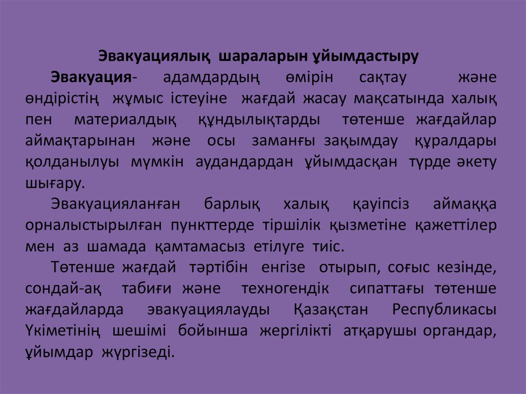 Эвакуациялық шараларын ұйымдастыруЭвакуация- адамдардың өмірін сақтау