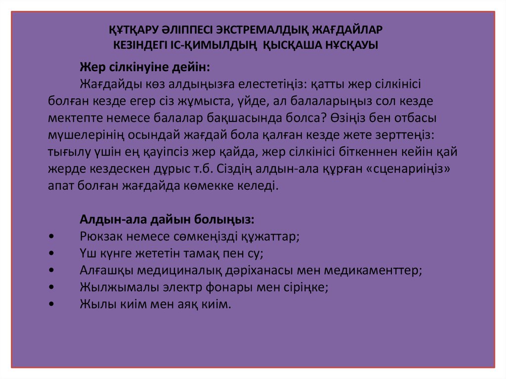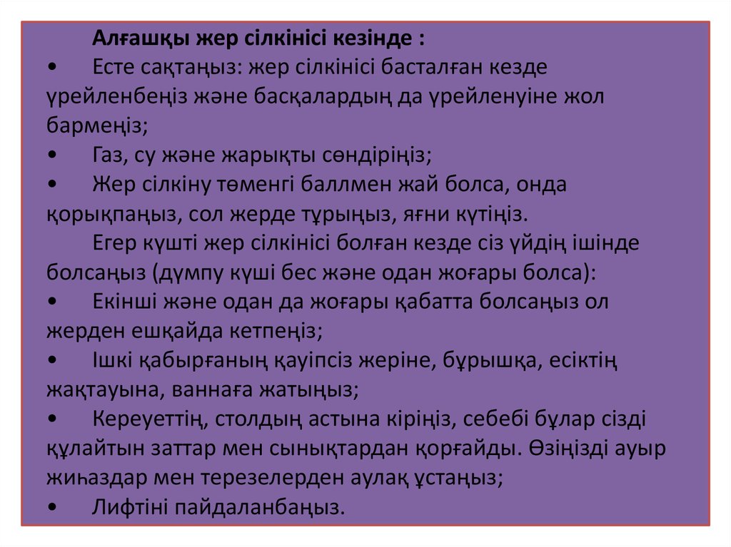 Алғашқы жер сілкінісі кезінде :• Есте сақтаңыз: жер сілкінісі басталған кезде