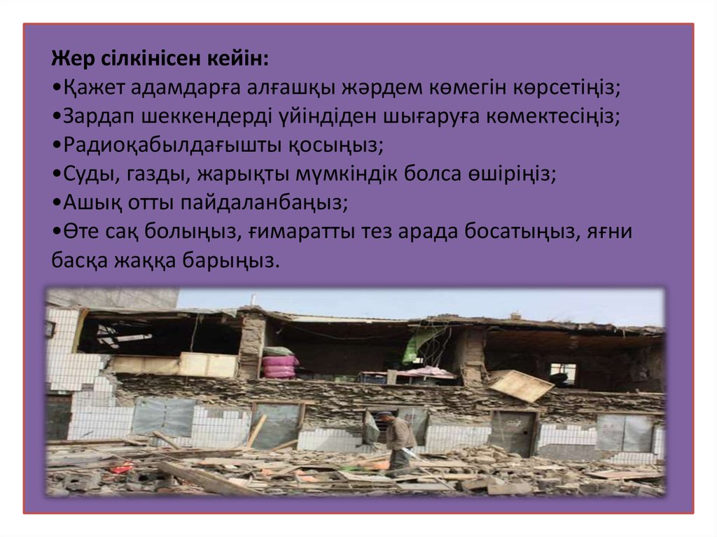 Жер сілкінісен кейін:•Қажет адамдарға алғашқы жәрдем көмегін көрсетіңіз;