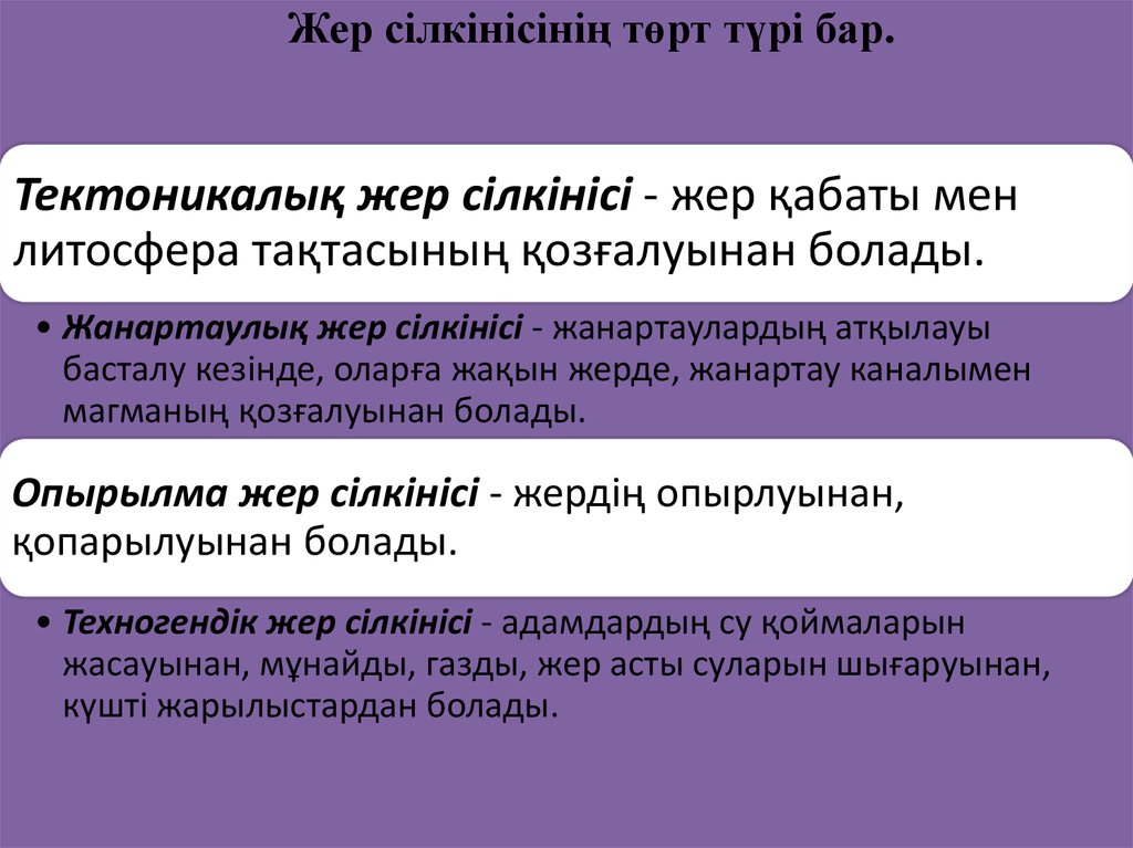 Жер сілкінісінің төрт түрі бар.Тектоникалық жер сілкінісі - жер қабаты мен