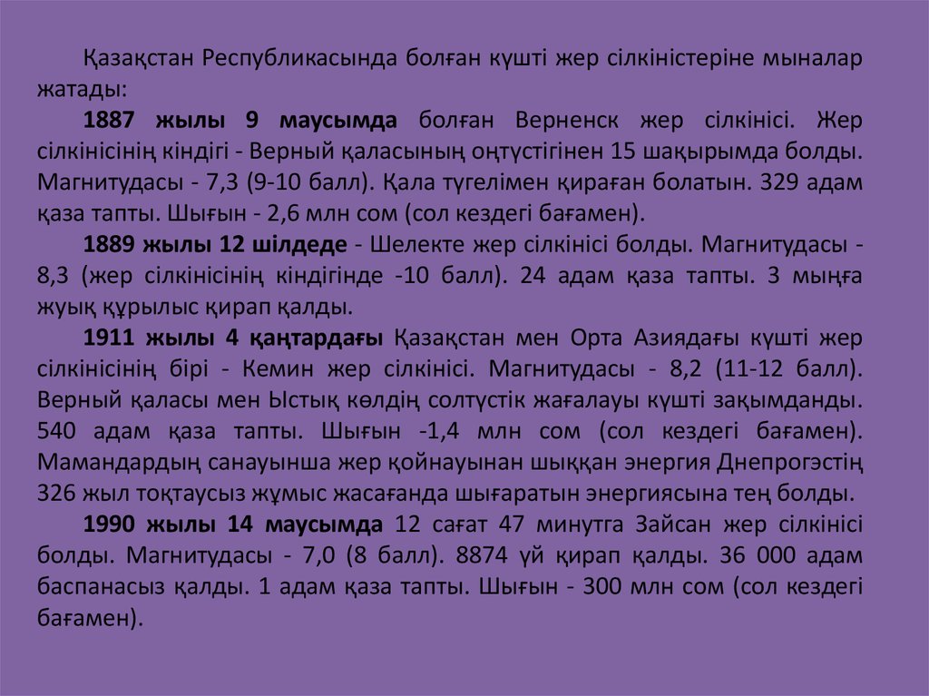 Қазақстан Республикасында болған күшті жер сілкіністеріне мыналаржатады: