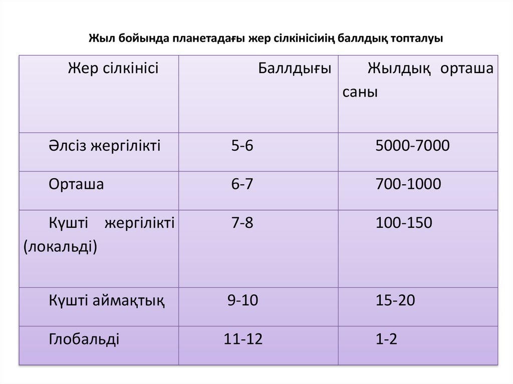 Жыл бойында планетадағы жер сілкінісіиің баллдық топталуыЖер сілкінісі