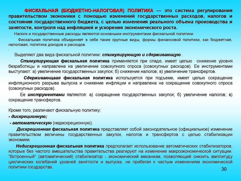 ФИСКАЛЬНАЯ (БЮДЖЕТНО-НАЛОГОВАЯ) ПОЛИТИКА — это система регулированияправительством экономики с помощью изменений государственных расходов, налогов и