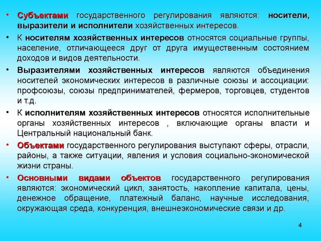 • Субъектами государственного регулирования являются: носители,выразители и исполнители хозяйственных интересов.
