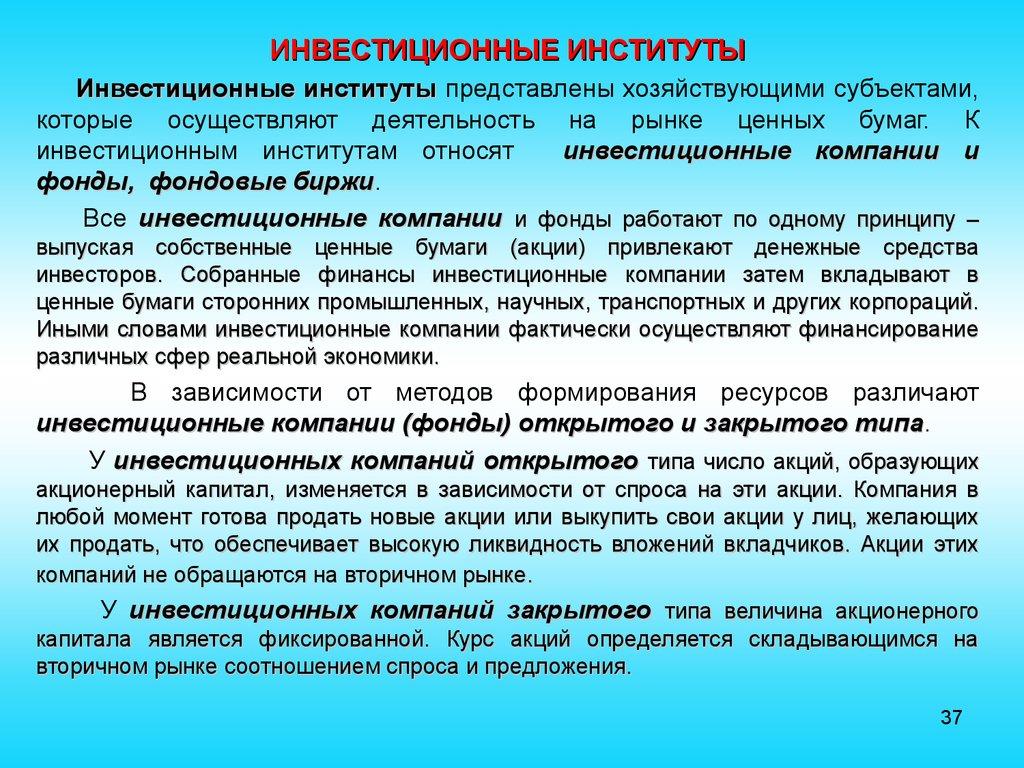 - инвестиционные институты (инвестиционные компании и фонды, фондовые биржи).