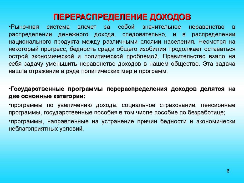ПЕРЕРАСПРЕДЕЛЕНИЕ ДОХОДОВ•Рыночная система влечет за собой значительное неравенство в