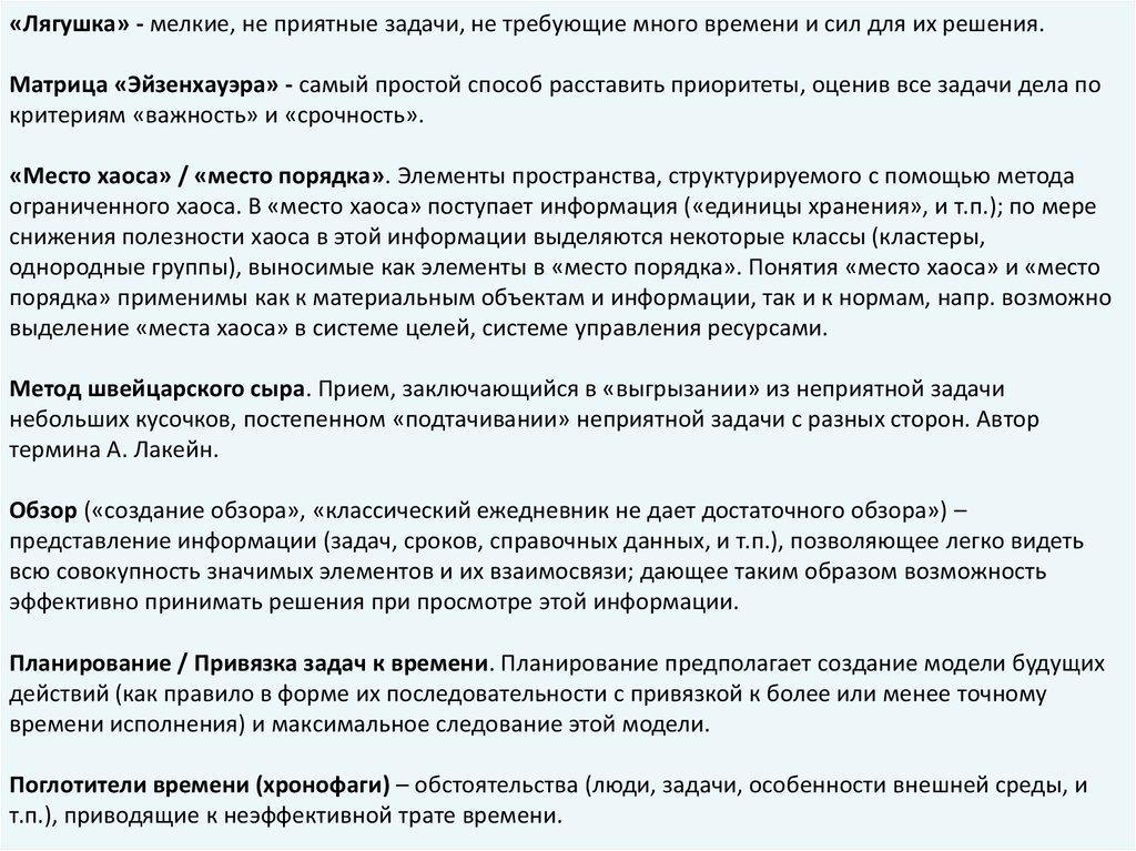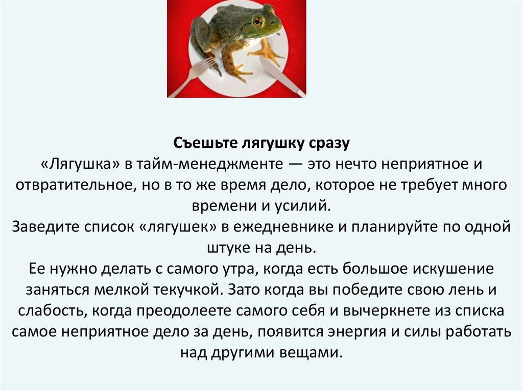 «Лягушка» - мелкие, не приятные задачи, не требующие много времени и сил для их решения.Матрица «Эйзенхауэра» - самый простой способ расставить приоритеты, оценив все задачи дела по