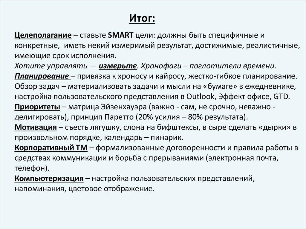 Итог:Целеполагание – ставьте SMART цели: должны быть специфичные и