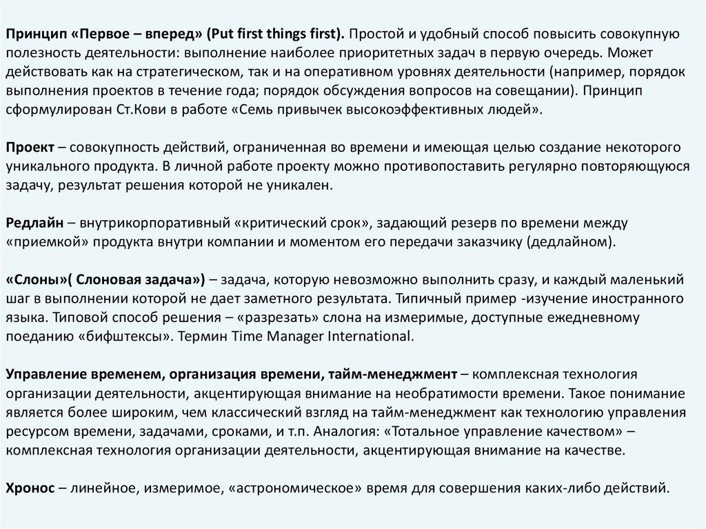Принцип «Первое – вперед» (Put first things first). Простой и удобный способ повысить совокупнуюполезность деятельности: выполнение наиболее приоритетных задач в первую очередь. Может