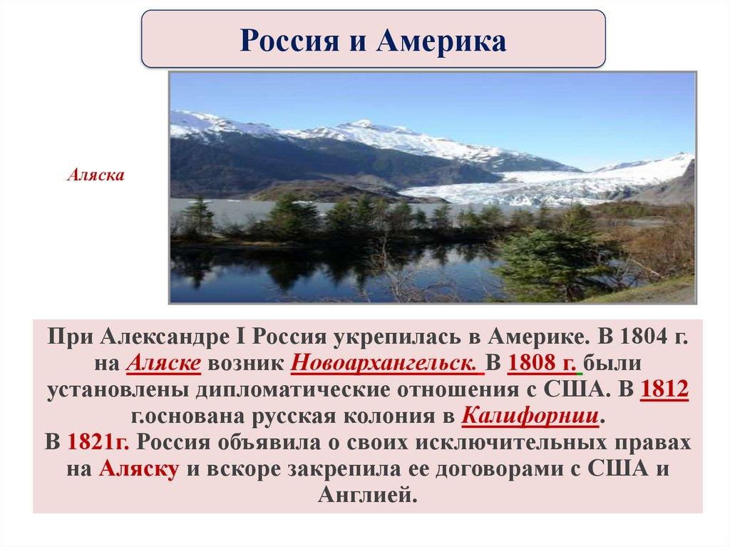 При Александре I Россия укрепилась в Америке.• 1804 г. на Аляске возник Новоархангельск.
