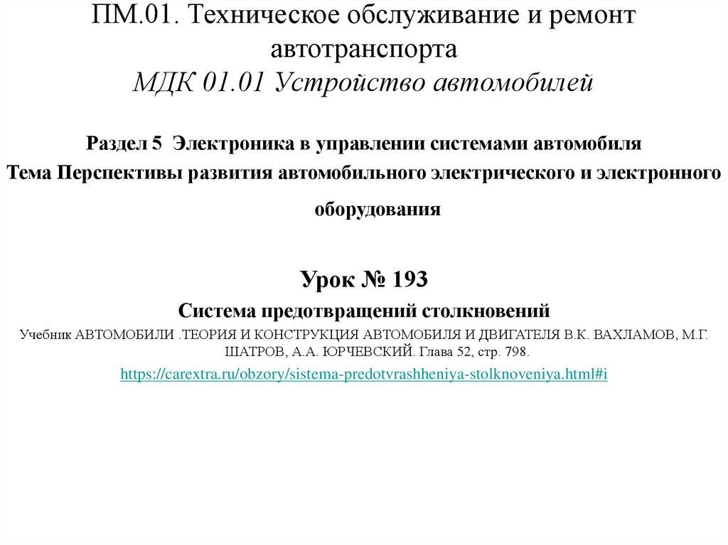 1. ПМ.01. Техническое обслуживание и ремонт автотранспорта МДК 01.01 Устройство автомобилей