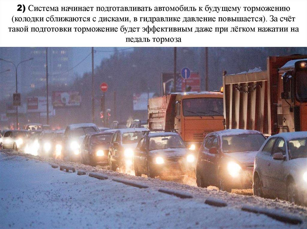 17. 2) Система начинает подготавливать автомобиль к будущему торможению (колодки сближаются с дисками, в гидравлике давление