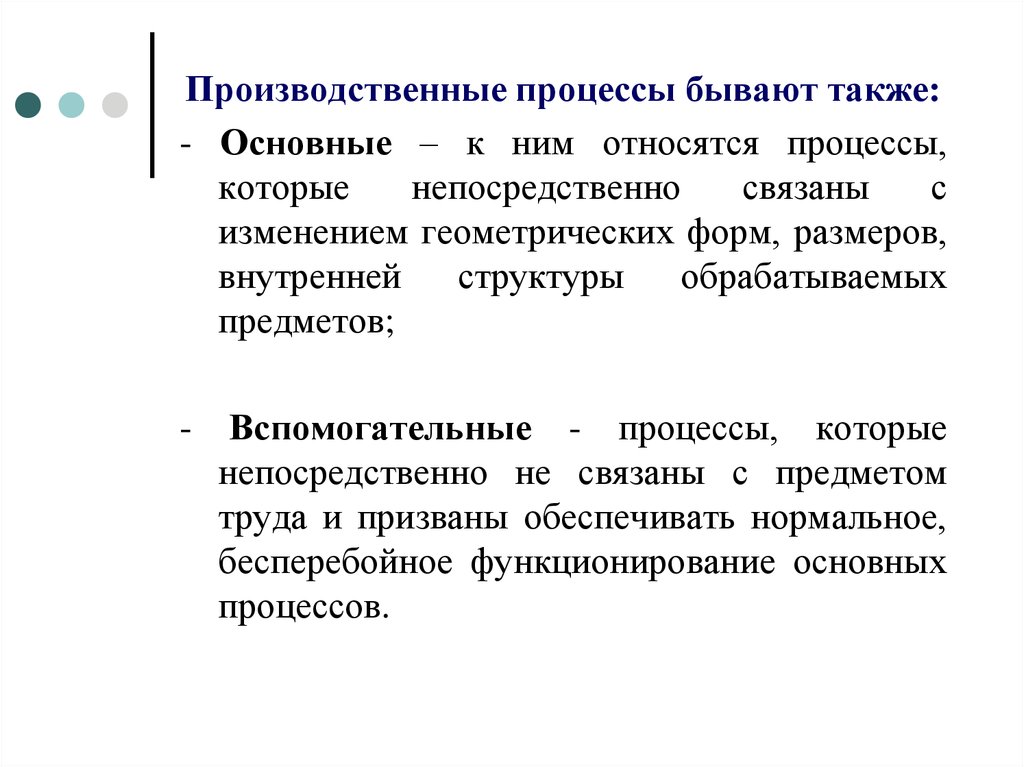 Производственные процессы бывают также:- Основные – к ним относятся процессы,