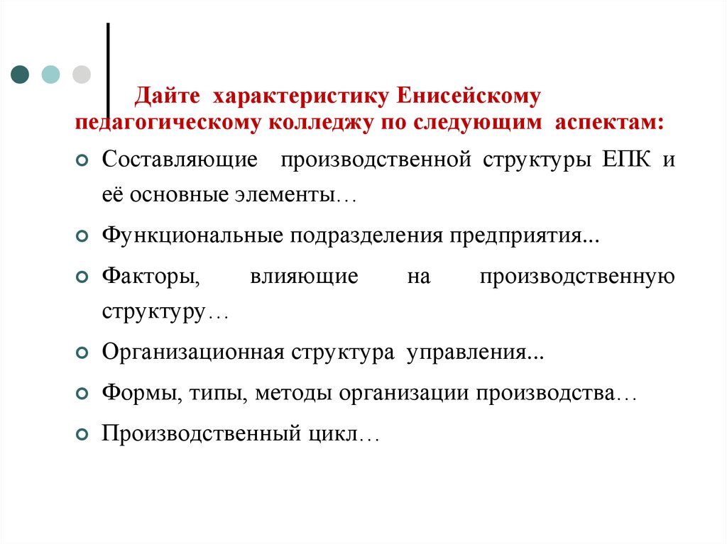 Дайте характеристику Енисейскомупедагогическому колледжу по следующим аспектам: