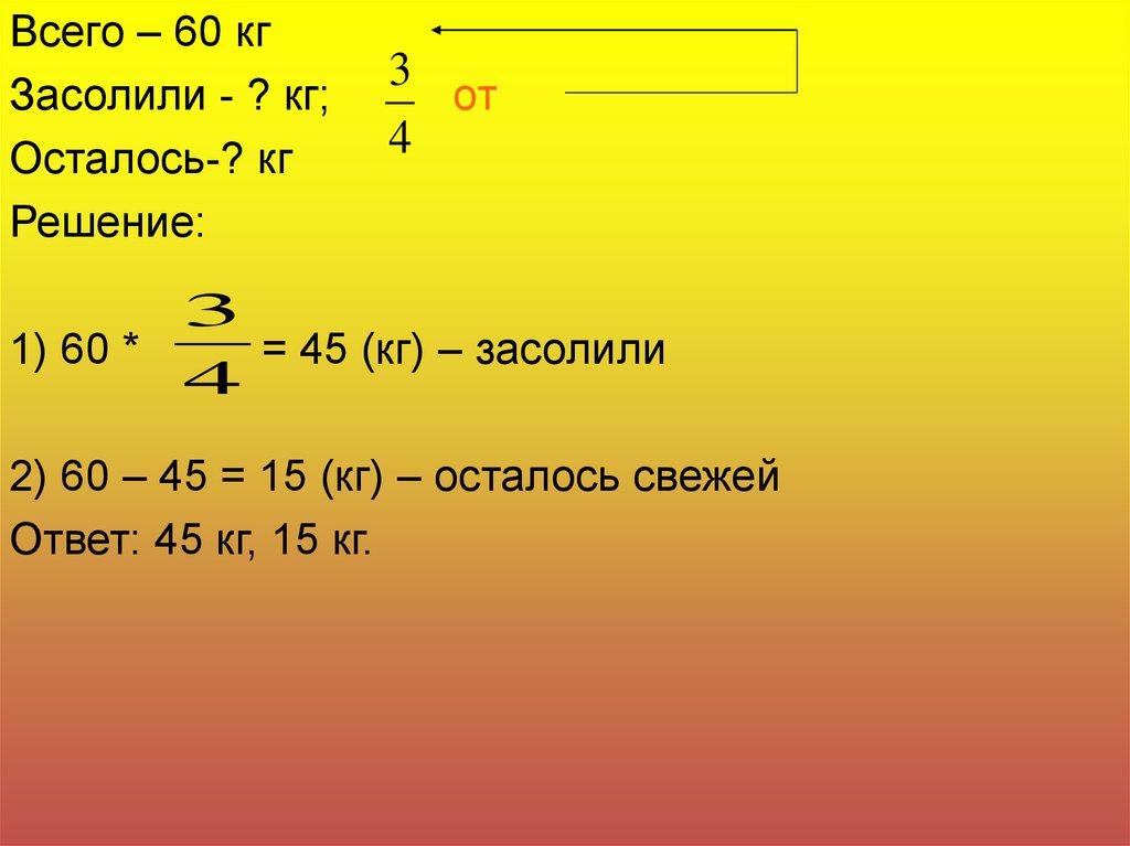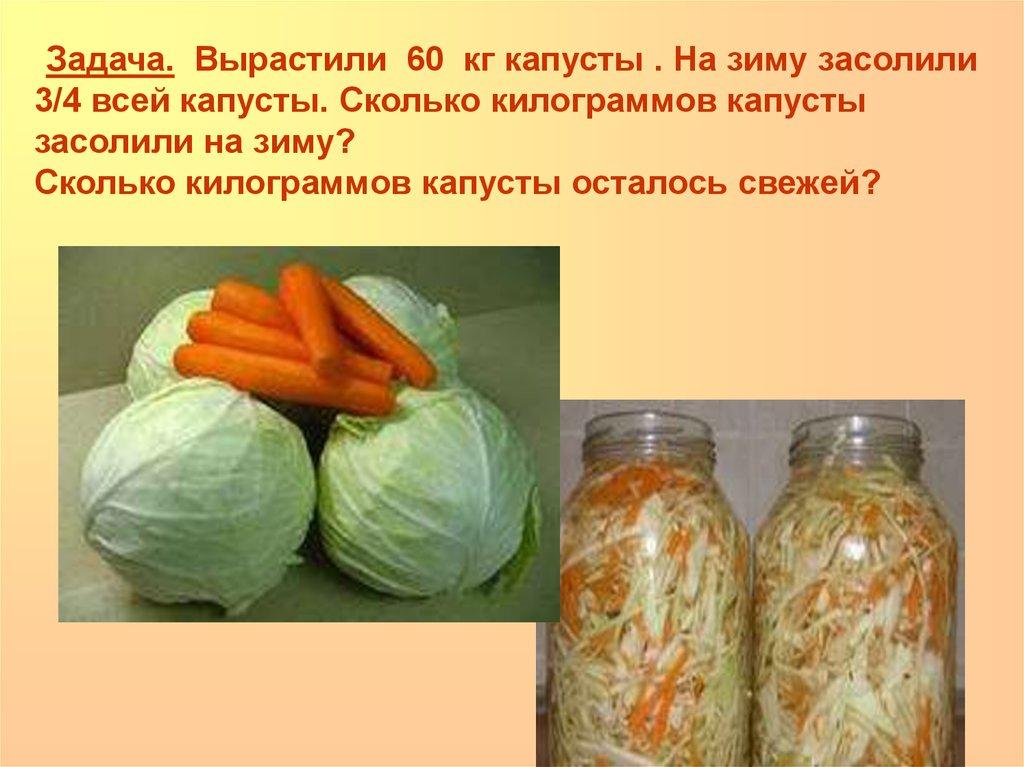 Задача. Вырастили 60 кг капусты . На зиму засолили3/4 всей капусты. Сколько килограммов капусты