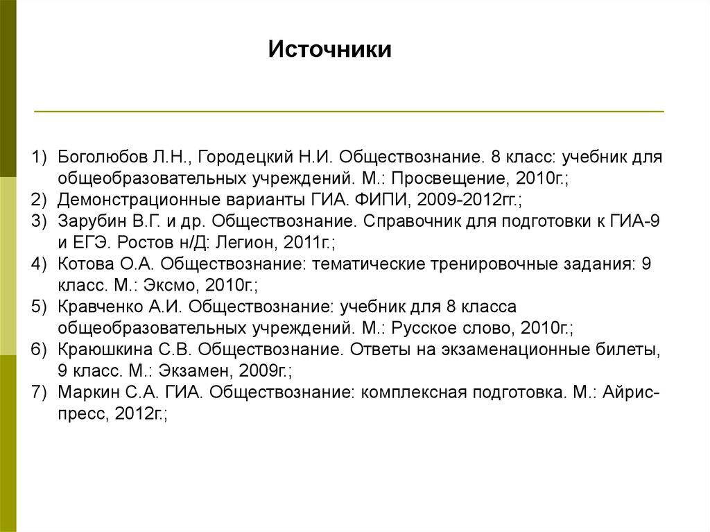 Источники1) Боголюбов Л.Н., Городецкий Н.И. Обществознание. 8 класс: учебник для