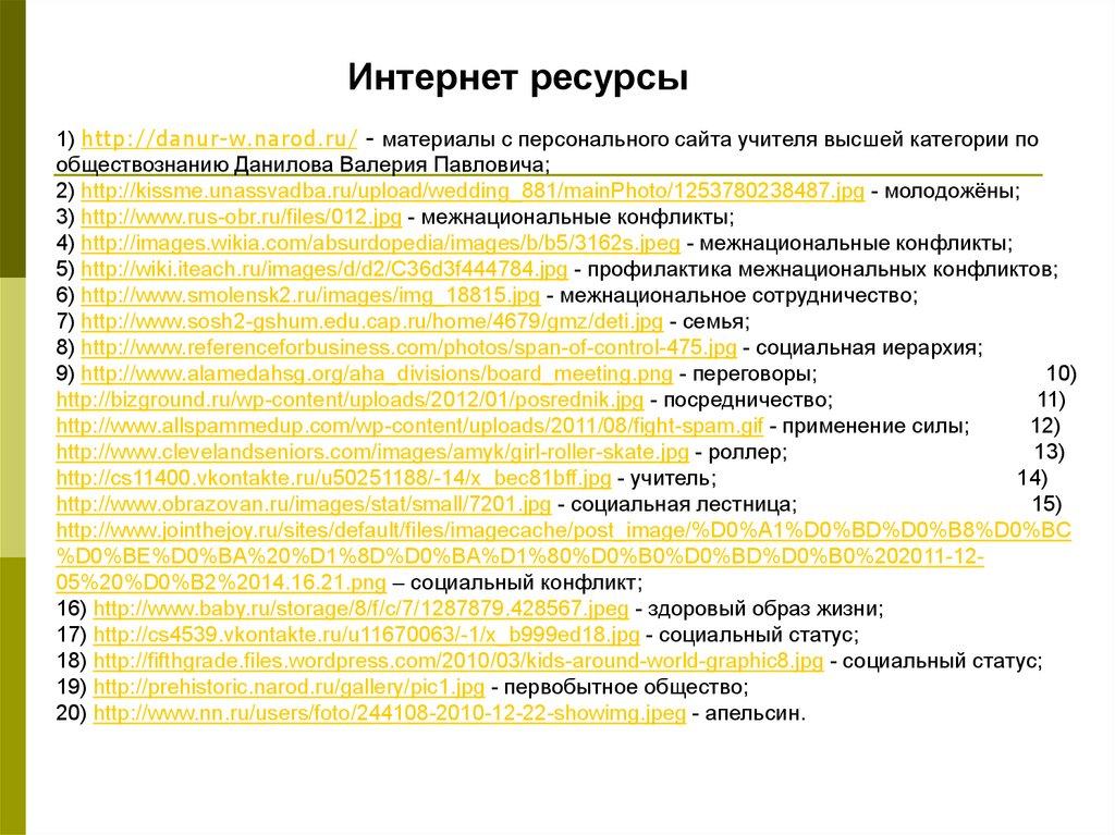 Интернет ресурсы1) http://danur-w.narod.ru/ - материалы с персонального сайта учителя высшей категории по