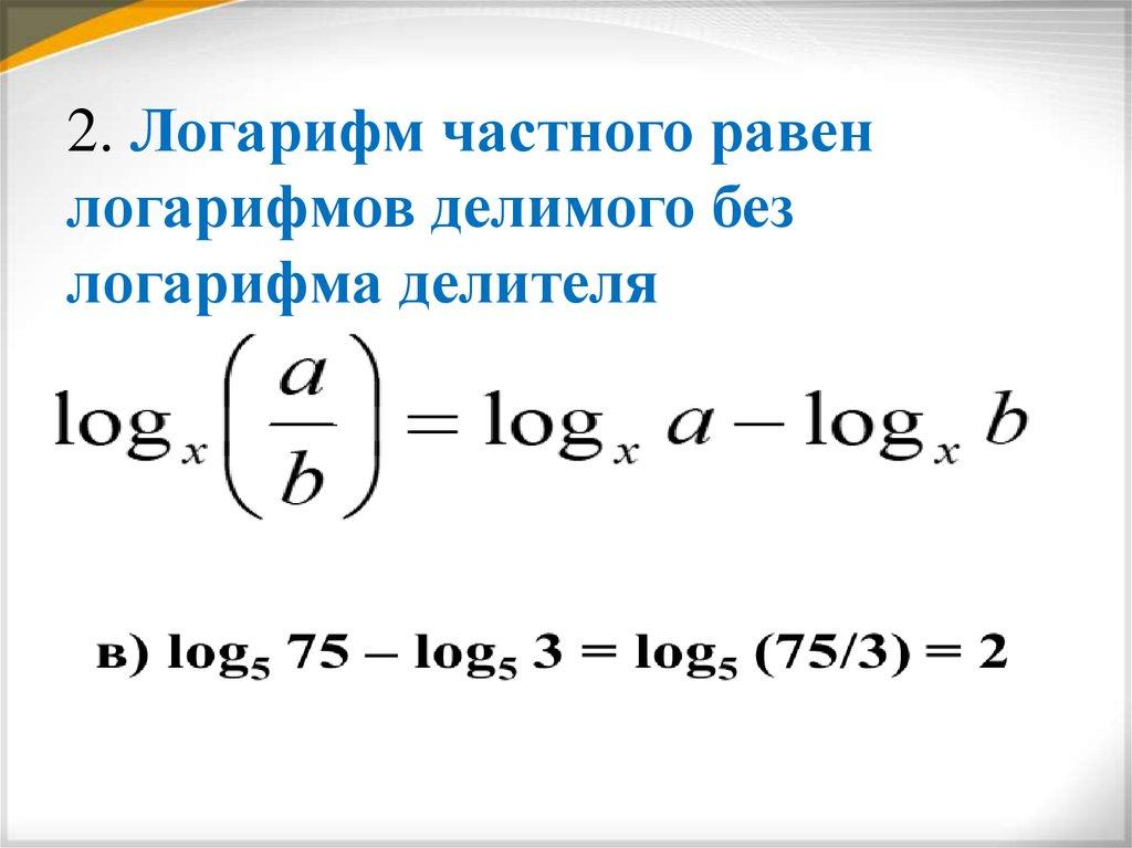 2. Логарифм частного равенлогарифмов делимого без