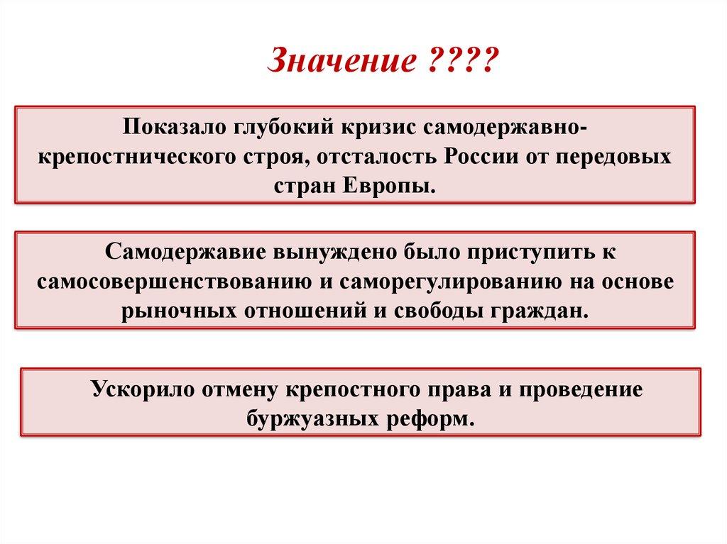Значение ????Показало глубокий кризис самодержавнокрепостнического строя, отсталость России от передовых