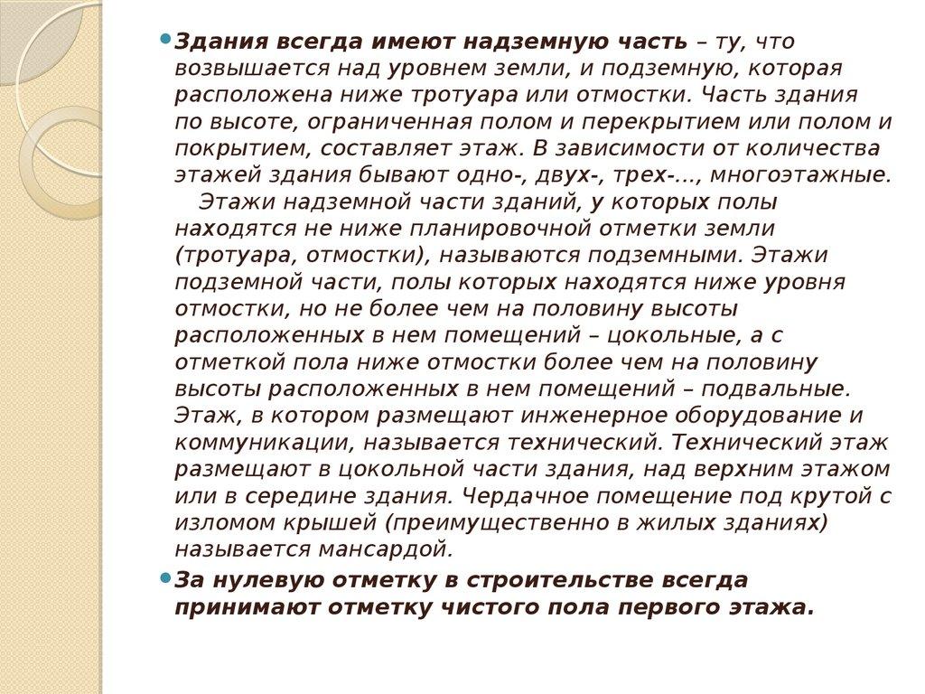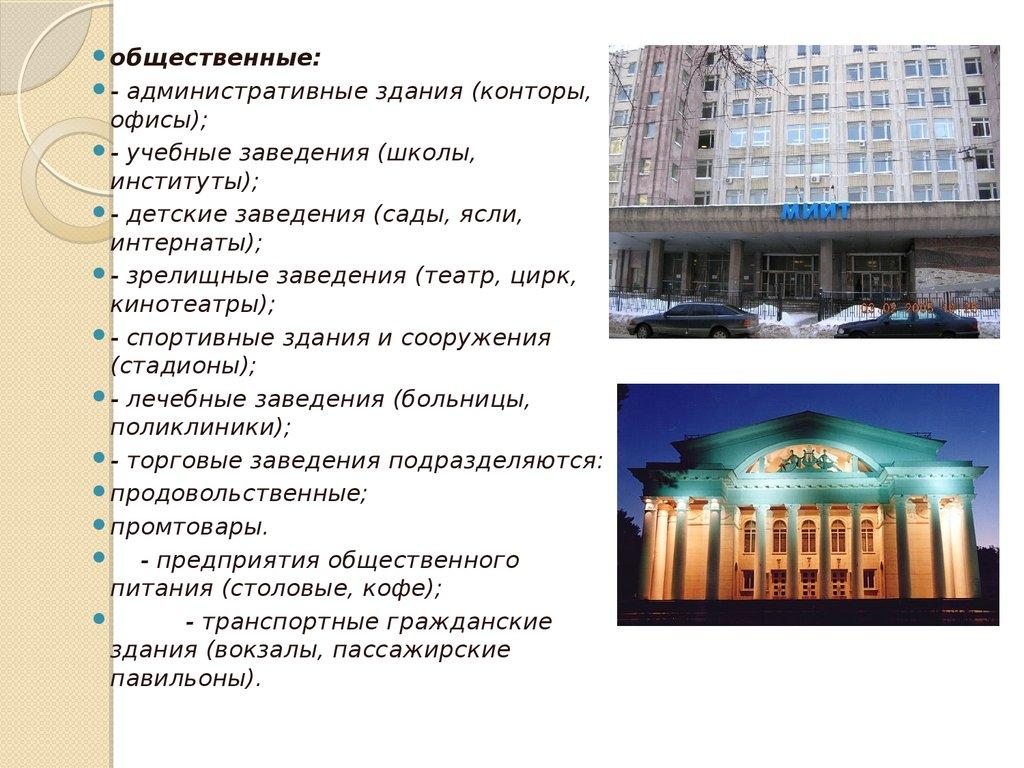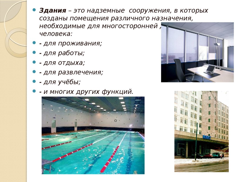 Здания – это надземные сооружения, в которыхсозданы помещения различного назначения,