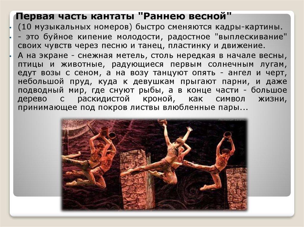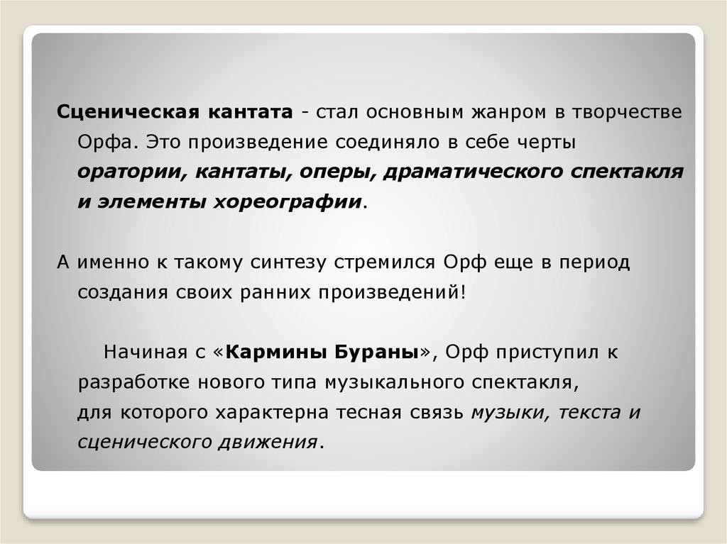 Сценическая кантата - стал основным жанром в творчествеОрфа. Это произведение соединяло в себе черты